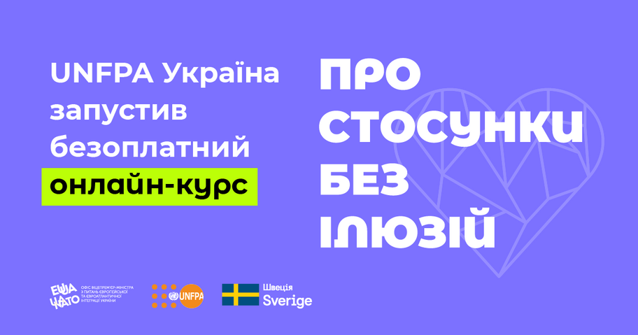 Онлайн-курс «Про стосунки без ілюзій» розроблений UNFPA, Фондом ООН у галузі народонаселення в Україні, у партнерстві з Офіс Віцепрем’єрки з питань європейської та євроатлантичної інтеграції та за підтримки уряду Швеції Embassy of Sweden in Kyiv