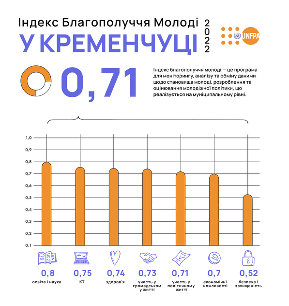 Індекс благополуччя молоді розроблено Фондом ООН у галузі народонаселення (UNFPA) за підтримки Міністерства молоді та спорту України. Більше про результати Індексу благополуччя молоді у місті Кременчуці – https://www.youthwellbeing.in.ua/cities/kremenchuk.