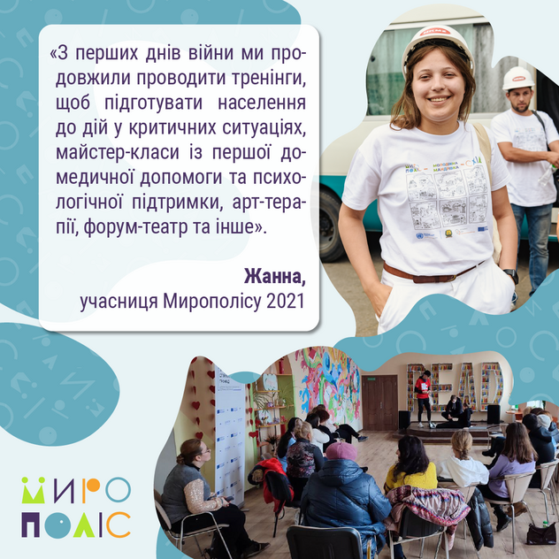 З перших днів війни ми продовжили проводити тренінги (ці проєкти у нас сталі, проводили їх ще у довоєнний час), щоб підготувати населення до дій у критичних ситуаціях, майстер-класи із першої домедичної допомоги та психологічної підтримки, арт-терапії, форум-театр та інше. Проводили часто, адже бажаючих було дуже багато, відпрацьовували нові вміння та навички, ділилися своїми думками та переживаннями.
