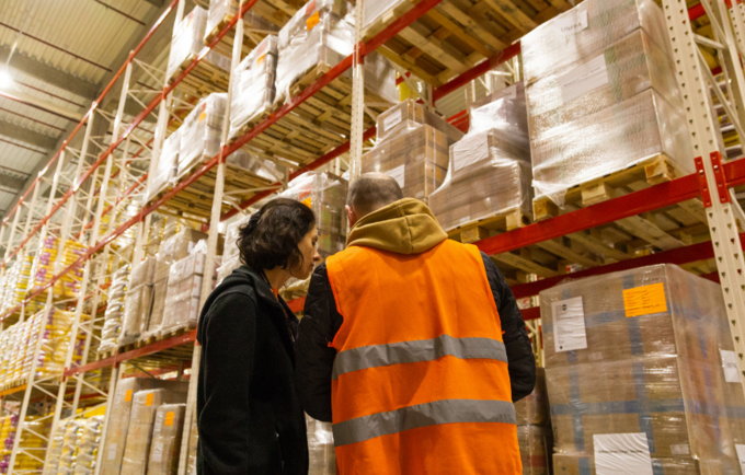 Старша регіональна координаторка UNFPA Оксана Андрушків (ліворуч) переглядає інвентаризацію невідкладних засобів репродуктивного здоров’я, які зберігаються на складі у Львові, для подальшого розподілу до медичних закладів у постраждалих від війни областях. © Галина Балабанова